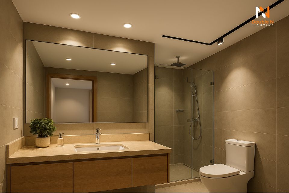 ควรเลือกดาวน์ไลท์กันน้ำมาตรฐาน IP44 ขึ้นไป และมีค่า CRI สูง เพื่อให้เห็นสีผิวชัดเจนขณะแต่งหน้า